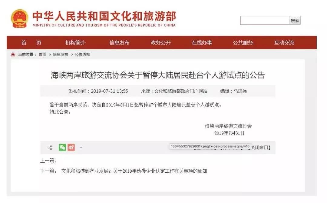 据文化和旅游部网站消息,海峡两岸旅游交流协会公告称,鉴于当前两岸关系,决定自2019年8月1日起暂停47个城市大陆居民赴台个人游试点。